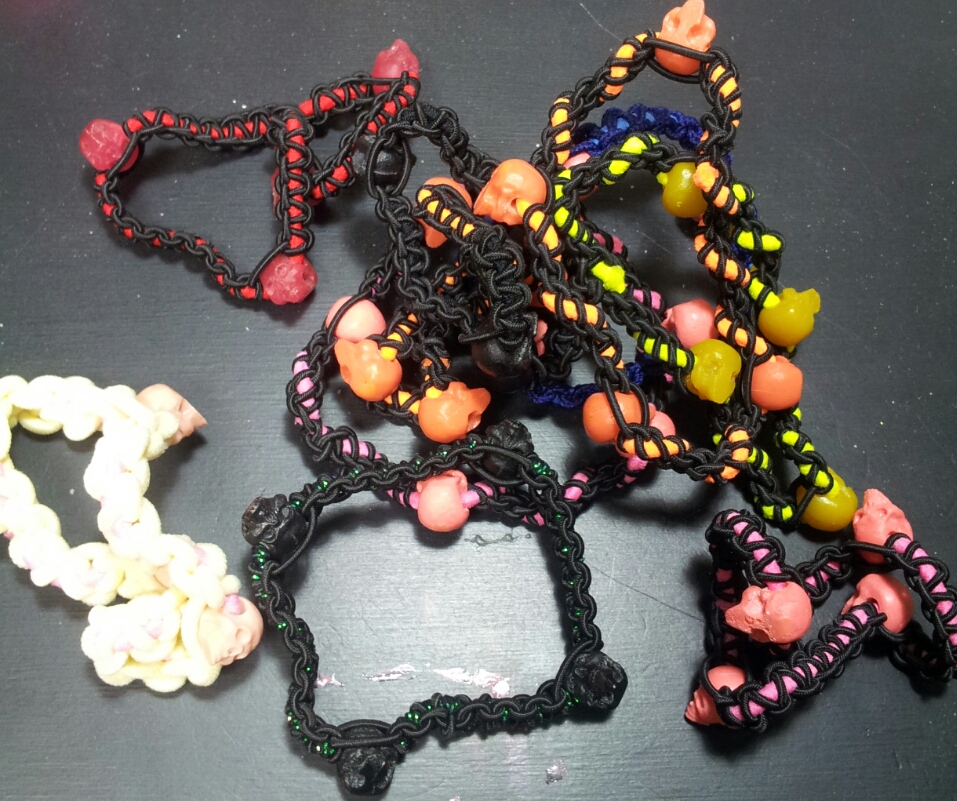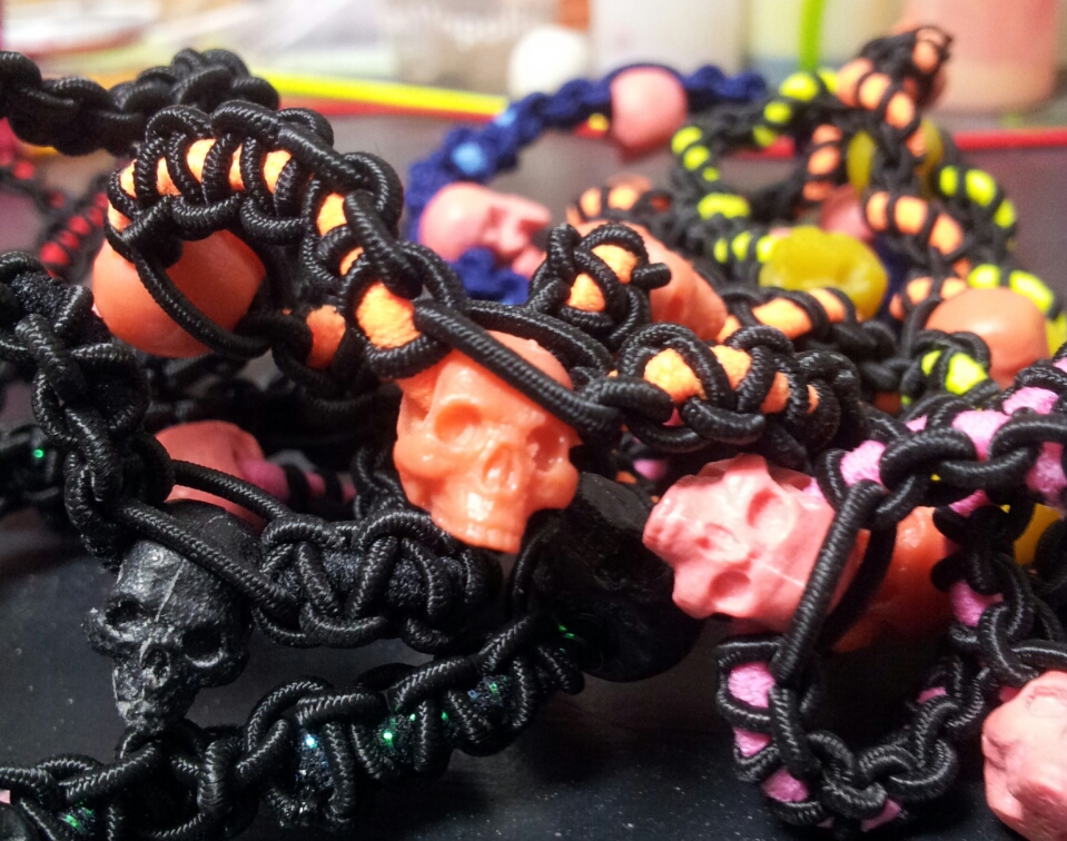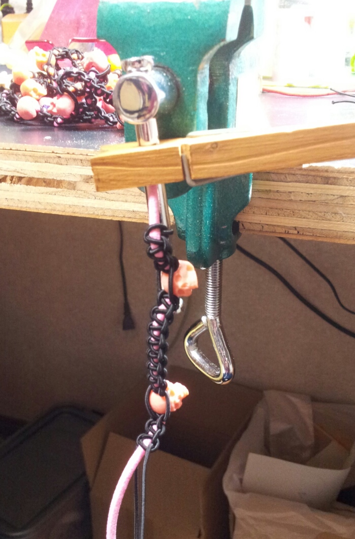 この間量産したミニスカルをヘアゴムに通して、さらにそれを細いヘアゴムで編んでいく( ´∀`)( ´∀`)